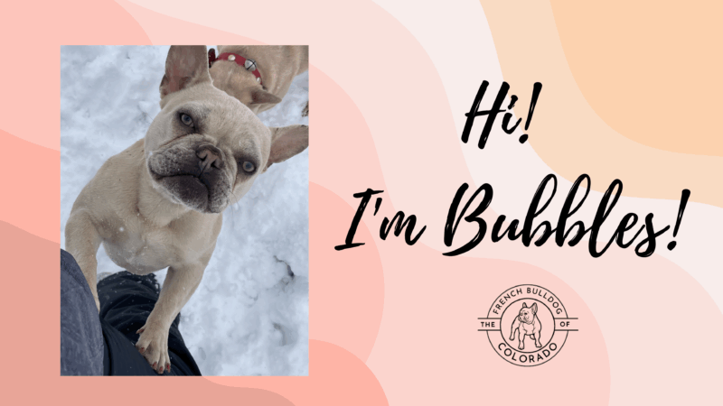 Hi, I’m Bubbles a lilac fawn merle French Bulldog. Lilac fawn means I’m a champagne color and the merle means I have other pieces of greyish color throughout my coat. The merle is hard to see but when you look close you can definitely tell. I also have light eyes. Momma says I carry cream. She’s pretty excited about this as I could have platinum colored puppies. My nicknames are Bubs and Bubby.